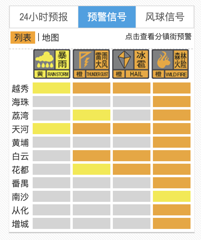 截至14:15,广州四预警齐挂,其中,越秀、天河暴雨黄色预警生效;越秀、天河、白云雷雨大风橙色预警生效,荔湾、花都雷雨大风黄色预警生效;越秀、天河、白云、花都冰雹橙色预警生效。此外11区森林火险预警生效中。